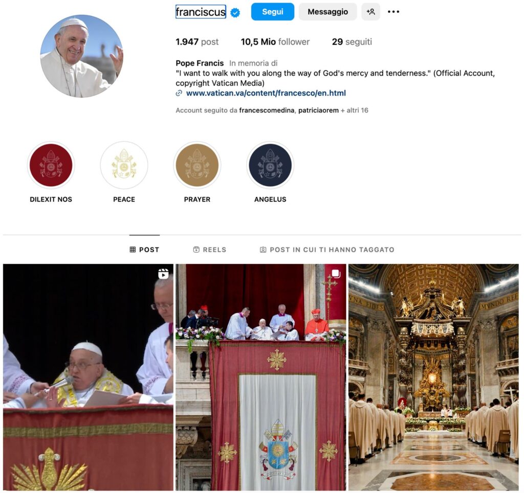 Nel 2016, quando fu aperto @franciscus, Instagram era ancora in ascesa. Oggi è uno dei centri dell’attenzione pubblica globale. Il terreno è maturo, e il Vaticano lo sa. A oggi circa 10 Milioni  con 1947 post.